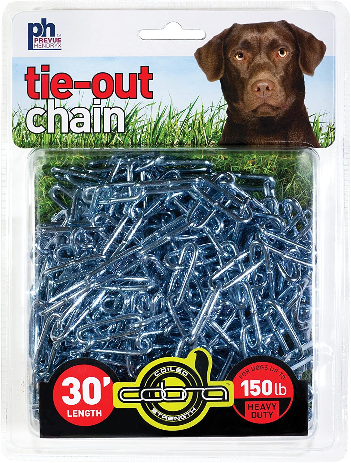 Prevue Pet Products heavy-duty 30í tie-out chain 2126 is designed for dogs up to 150 lbs. Zinc plated welded oval links are strong, ensuring your dog stays safe and secure. Premium quality die-cast iron swivel bolt snaps at both ends connect easily and prevent tangling. Heavy duty tie out chain is 30 foot long and 3.8 mm in diameter.